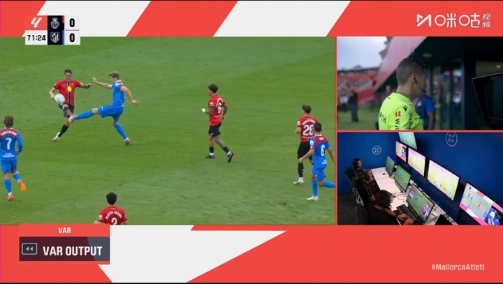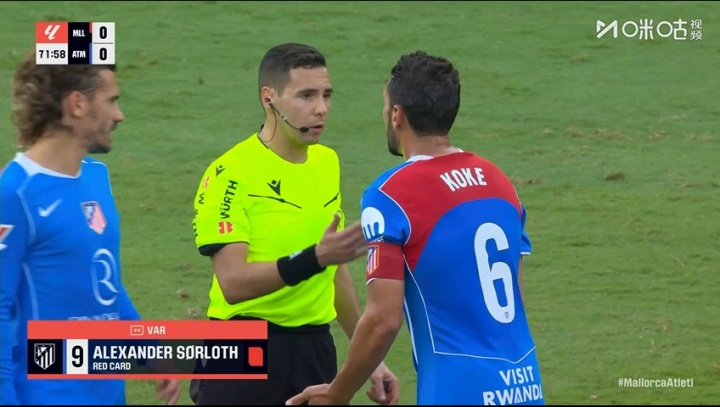 马竞第72分钟少打一人!索尔洛特亮鞋钉蹬踏,裁判 看VAR后出直红