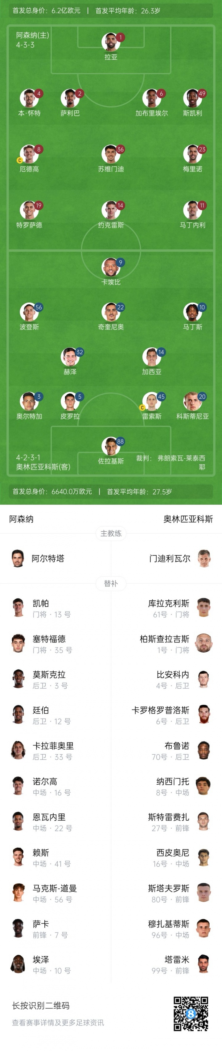 阿森纳杆位:1-拉亚、2-萨利巴、4-本-怀特、6-加布里埃尔、49-斯凯利、8-厄德高、36-苏维门迪、23-梅里诺、11-马丁内利、19-特罗萨德、14-约克雷斯