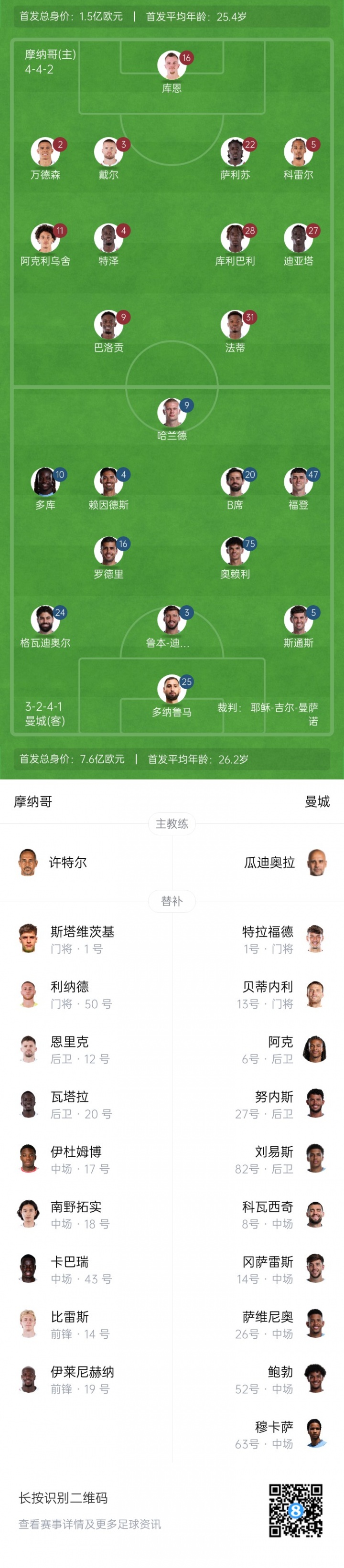 曼城客战摩纳哥杆位:哈兰德、罗德里先发,福登、斯通斯出战