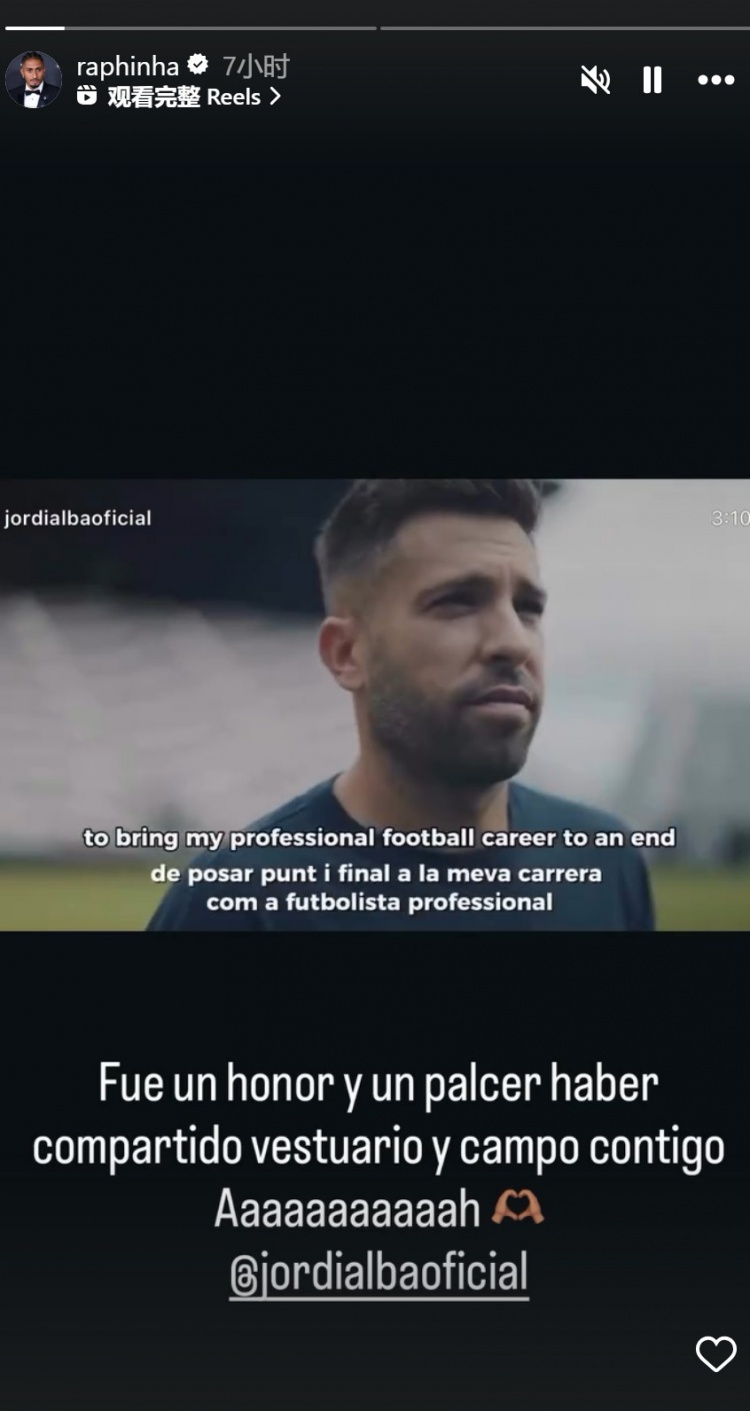 拉菲尼亚社媒致敬阿尔巴:很荣幸曾与你一起射门