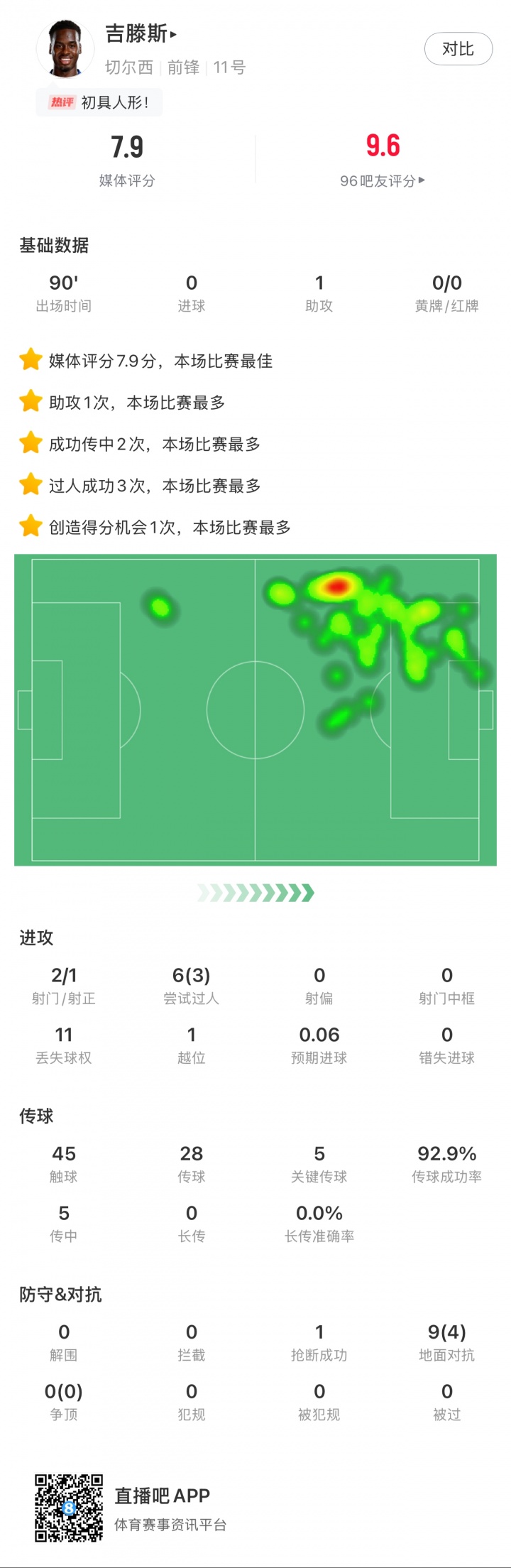 本场赛事 ,吉滕斯2次射球 1次射正,6次尝试过人3次成功,28次传送球 26次成功,传送球 成功率92.9%,5次关键传送球 ,24直播网创造1次良机,收获1次助功 ,获评7.9分全场最高,当选欧冠官方评选的最有价值球员。