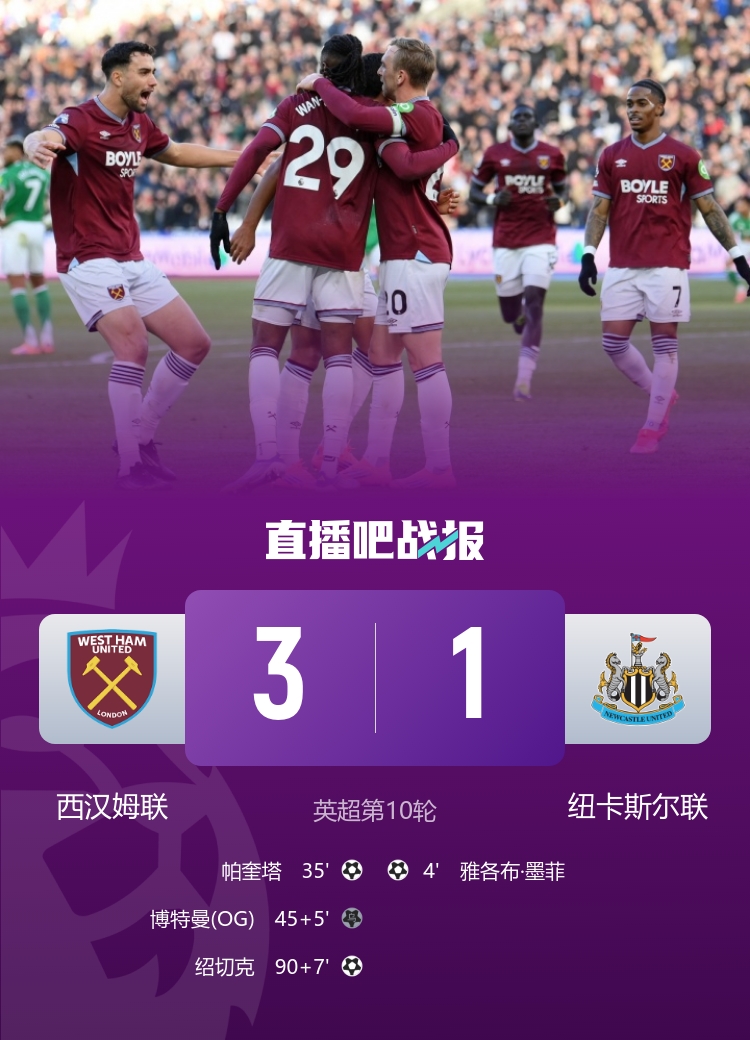 英超-西汉姆联3-1纽卡结束6轮不胜 帕奎塔世界波万比萨卡造乌龙