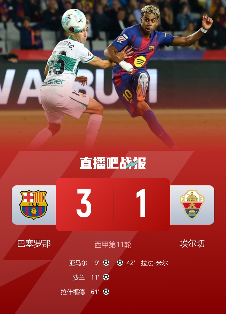 本轮西甲,巴萨3-1击败埃尔切,拉什福德、费兰和亚马尔各入一球。