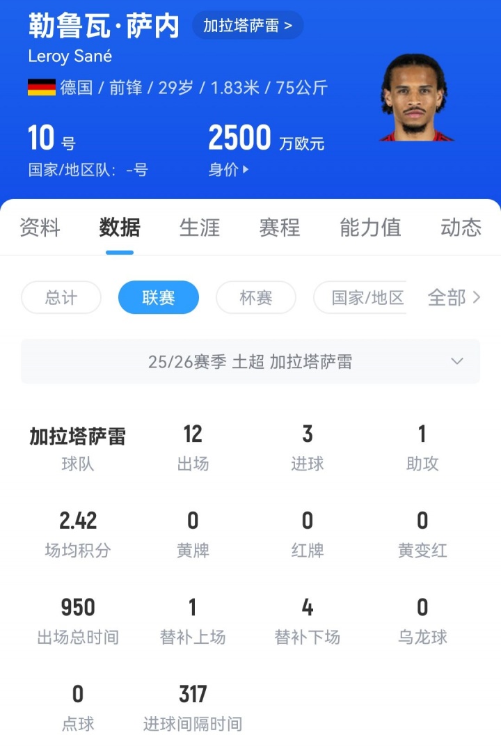 本赛季萨内代表加拉塔萨雷出战15场赛事 ,贡献3粒得分 和2次助功 ,其中土超12轮3球1助。