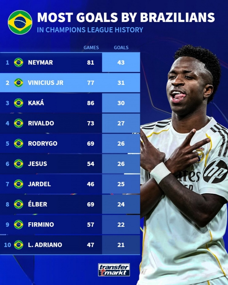 2月18日讯 德国转会市场统计了巴西球员在欧冠的得分 数量,并列出欧冠历史巴西球员射手榜,内马尔43球居首,维尼修斯31球次席。
