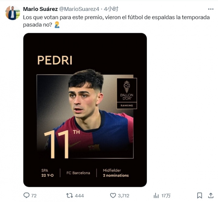 佩德里金球第11❗马竞旧将:这些评奖的人,上赛季看球了吗?