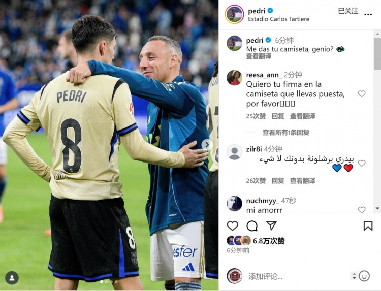 巴萨中场球员佩德里更新社媒动态马竞01米兰新闻,晒出与皇家奥维耶多40岁中场球员卡索拉的赛后合照,英超直播免费高清无插件对其表达敬意,配文:“天才,能把你的运动活动 服 给我吗?”