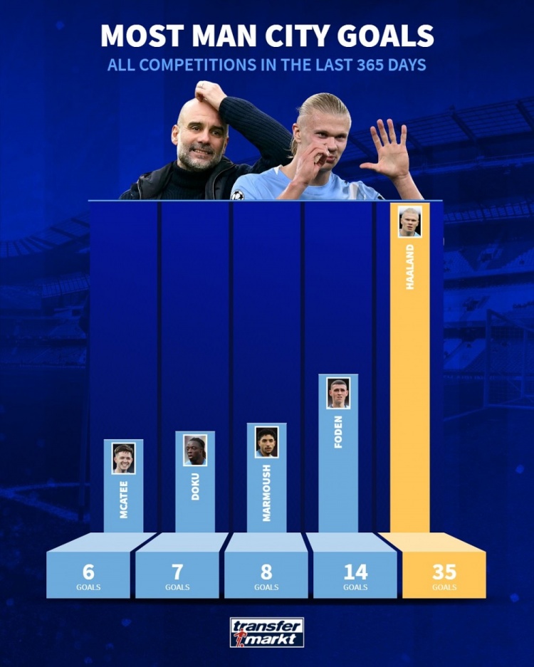 近一年曼城队内射手榜:哈兰德35球断层居首,福登14球次席
