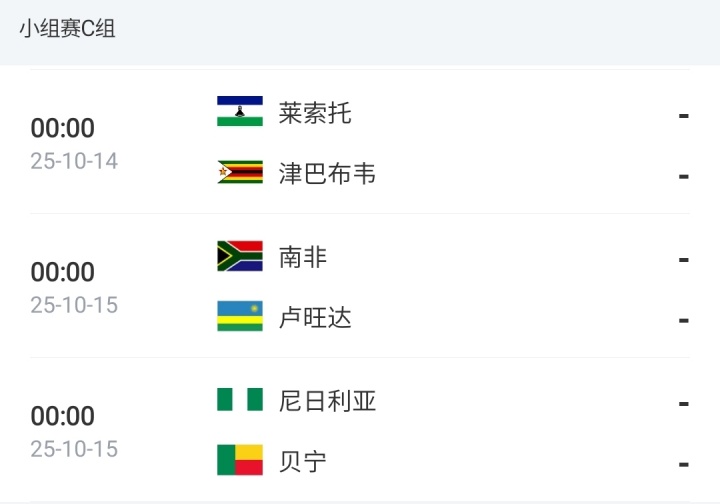 目前C组积分榜上,贝宁2分领跑;南非因派出违规球员,对阵莱索托的赛事 被判0-3负,随后又遭垫底队逼平,目前追赶 2分;坐拥奥斯梅恩、卢克曼、伊沃比等名将的尼日利亚追赶 3分。