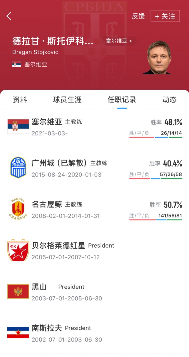 塞尔维亚籍指导教练员德拉甘·斯托伊科维奇,从2021年3月起执教塞尔维亚国家队,共取得26胜14平14负的战绩,目前塞尔维亚在世预赛欧洲区K组中排名小组第3。在斯托伊科维奇的指导教练员生涯中,他还曾执教过名古屋鲸、中超广州城等球队。