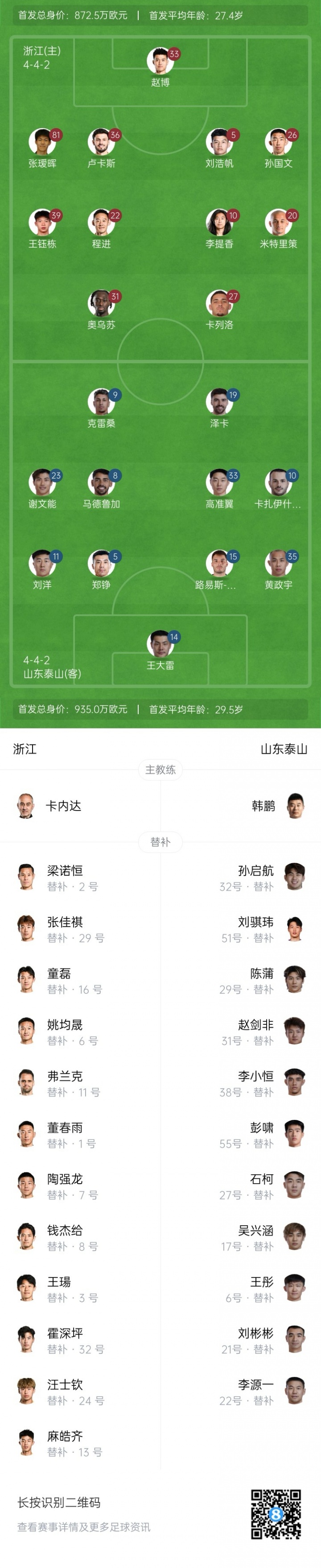 浙江vs泰山杆位:4外援PK5外援,王钰栋先发,谢文能、高准翼出战