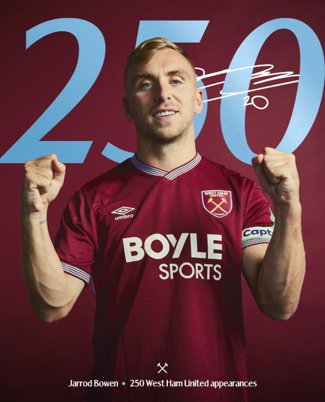 本赛季3球2助,鲍文迎西汉姆联生涯250场里程碑之战