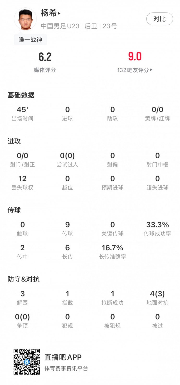 杨希半场数据:3解围1阻拦 1抄截 3次成功地面对峙 ,半场评分6.2
