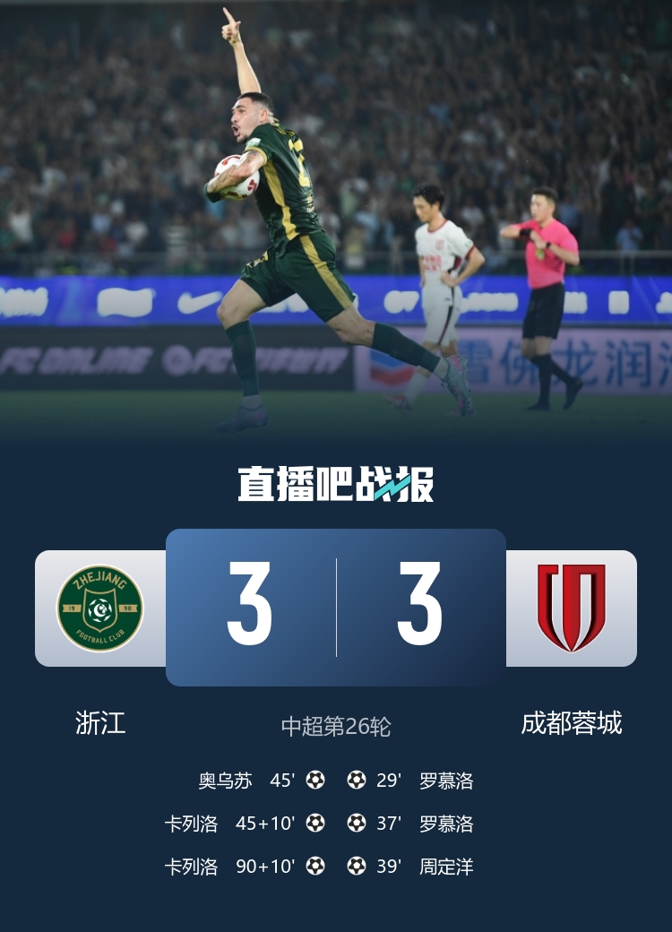 蓉城第100分钟遭浙江3-3绝平,积分遭海港反超,海港2分领跑