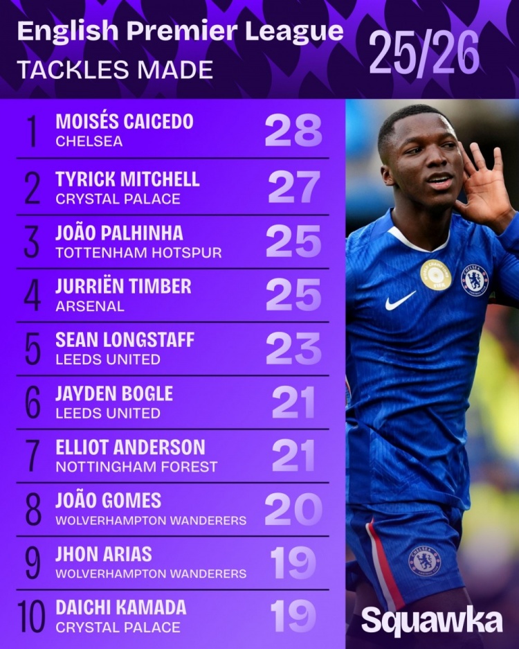 10月7日讯 Squawka统计了本赛季英超抄截 榜前十,切尔西中场球员凯塞多28次位居第一,免费看英超的软件阿森纳后场球员廷伯25次第四。