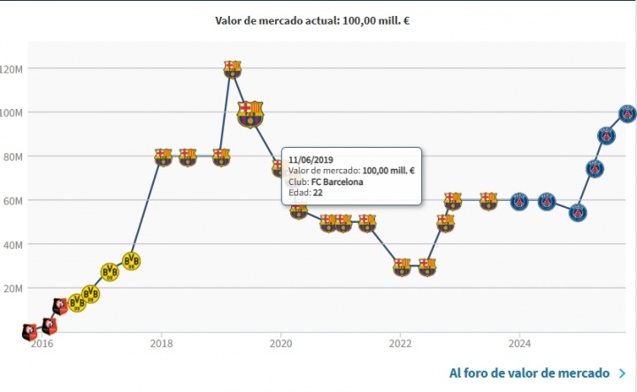 登贝莱身价最低时只有3000万欧,上次身价达到1亿欧元,还要追溯到2019年效力于巴萨时期。