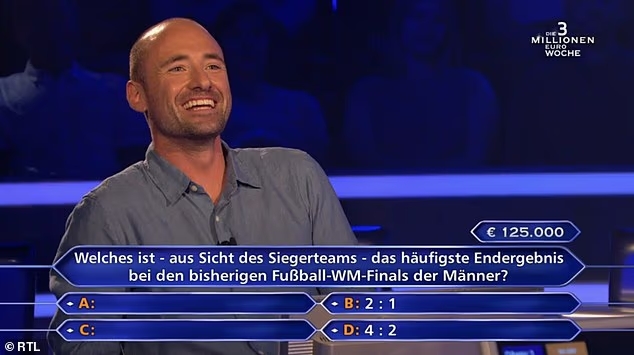 马克-奥芬巴赫尔在这档节目中一路过关斩将,将奖金积累到了可观的数额,这时主持人向他提出了新问题:“男足世界杯赛 总决赛 中,出现最多的比分是多少?1-0?2-1?3-1?还是4-2?”