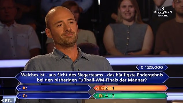 10月11日讯 在德国版的《谁想成为百万富翁》智力竞赛节目中,一位参赛者没能回答对世界杯赛 总决赛 的比分,错失12.5万欧元(约103万人民币)奖金。