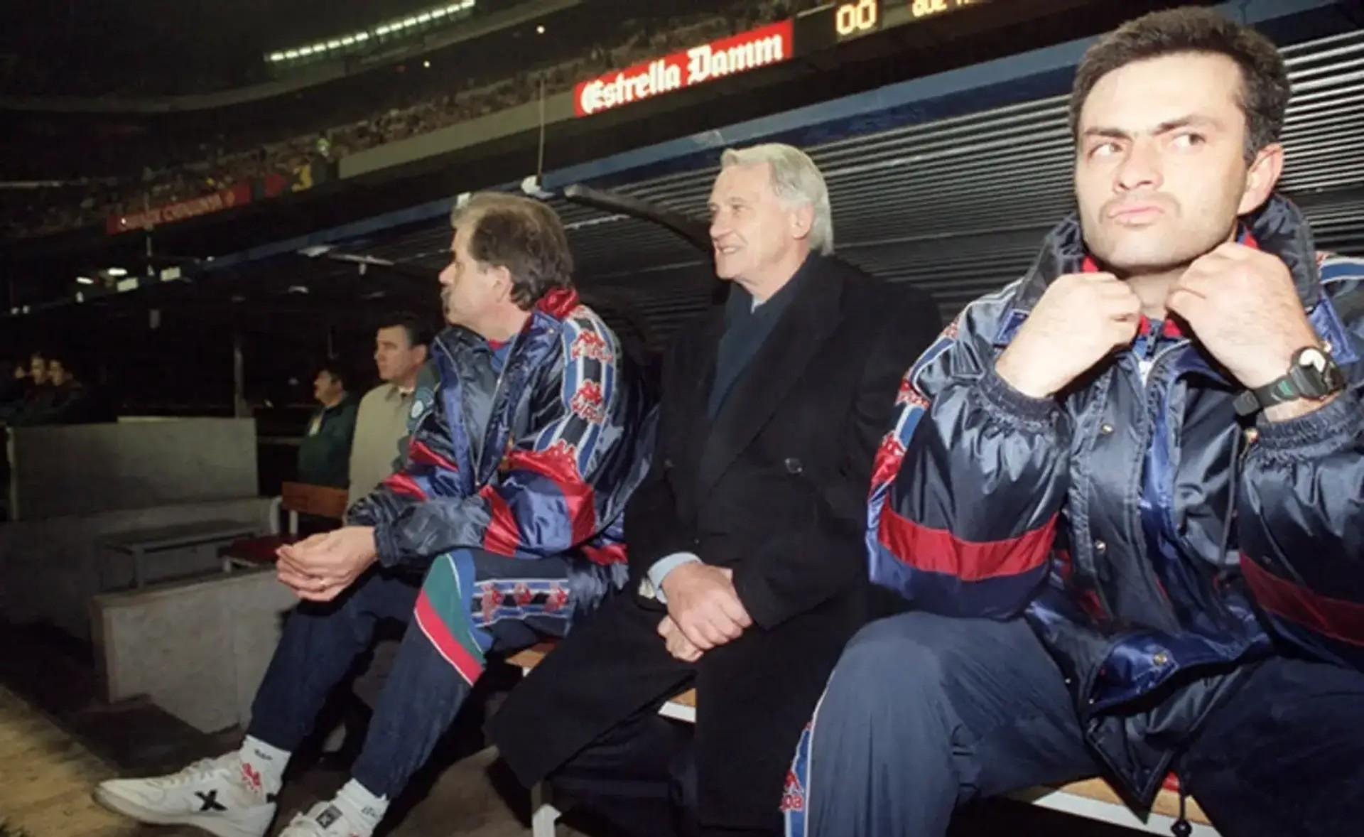 15. 范加尔执教巴塞罗那期间,穆里尼奥担任助理指导教练员,曾临时执掌巴萨一线队,带队参加过友情 赛和加泰罗尼亚杯。
