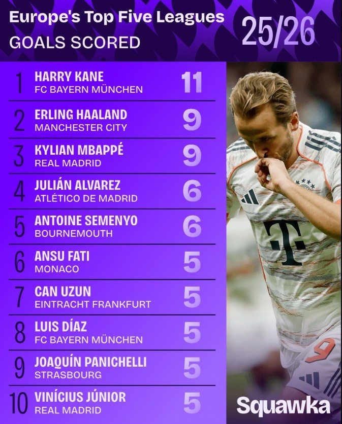 直播吧10月17日讯本周末,欧洲五大职业联赛 将重燃战火。Squawka盘点了本赛季迄今为止五大职业联赛 得分 数情况,178足球直播官网凯恩以11球居首,哈兰德和姆巴佩均打进9球紧随其后。