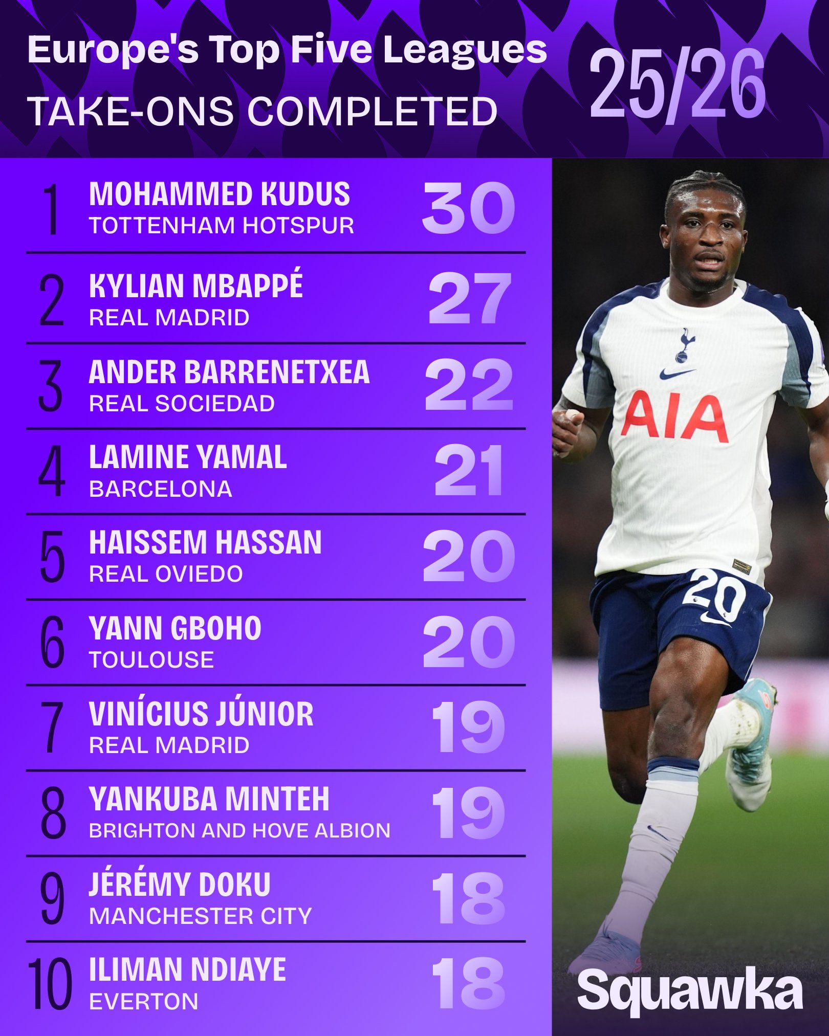 30次, 库杜斯是本赛季至今五大职业联赛 过人次数最多的球员