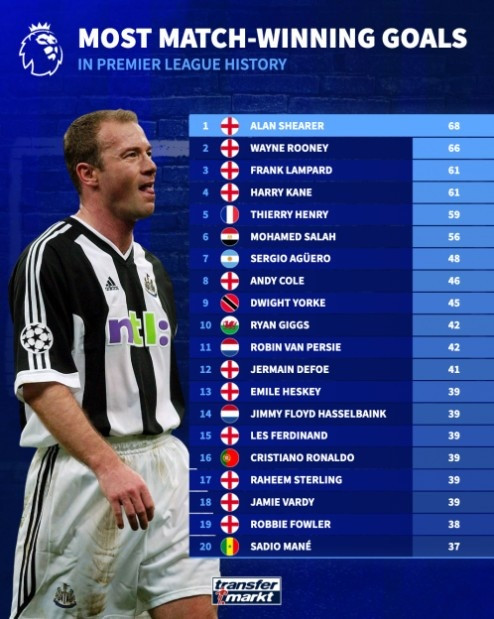 英超历史打进制胜球球员排行: 希勒68球居首, 鲁尼66球位居次席
