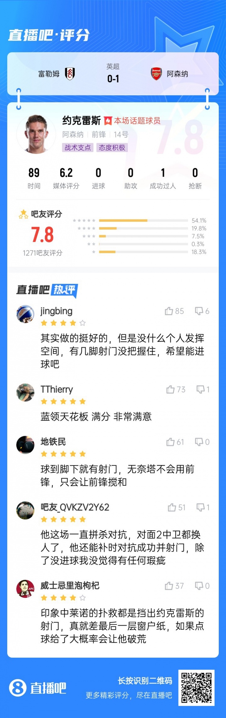 10月19日讯 英超第8轮,阿森纳1-0客胜富勒姆,3分领跑英超。约克雷斯3射2正,178足球直播官网已经7场赛事 没有为阿森纳得分 。