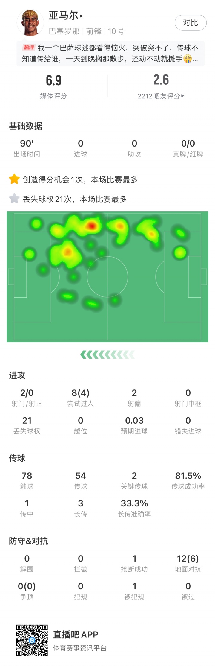 10月27日讯 本赛季首场西班牙国家德比皇马战胜巴萨,本场赛事 巴萨小将亚马尔碌碌无为,这与赛前他的高调形成反差!亚马尔本场2射0正+2关键传送球 8过人4成功+21丢失球权获评6.9分!