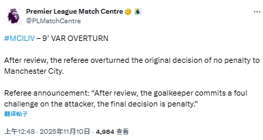 11月10日讯 英超第11轮曼城vs利物浦第9分钟,多库遭马马尔达什维利绊倒,英超官方解释判决 十二码球原因。