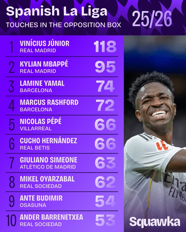 本赛季西甲在对方危险区域 内触球榜:维尼修斯118次居首,姆巴佩第二