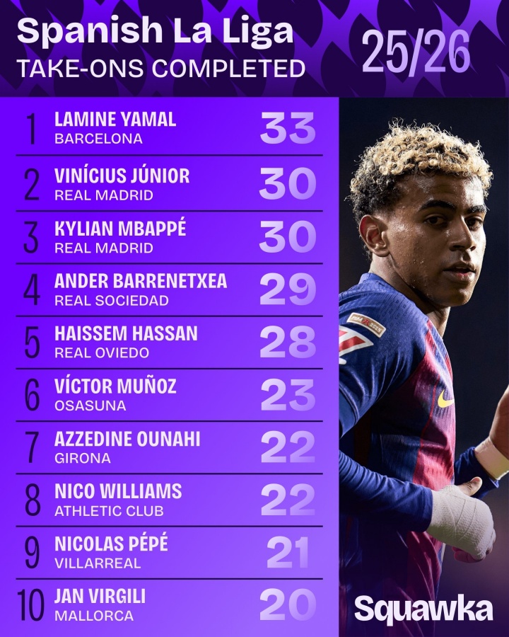 本赛季西甲过人榜:亚马尔33次第1,维尼修斯和姆巴佩30次并列第2