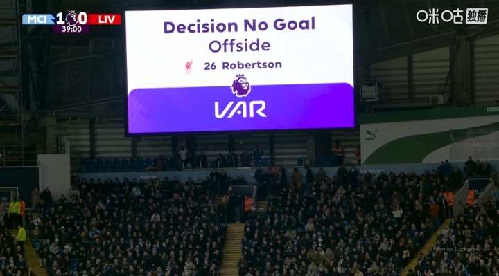 11月12日讯 曼城3-0利物浦赛事 的第38分钟,范戴克顶球破门,但VAR判定罗伯逊越位违例 位置干扰,得分 被判无效。