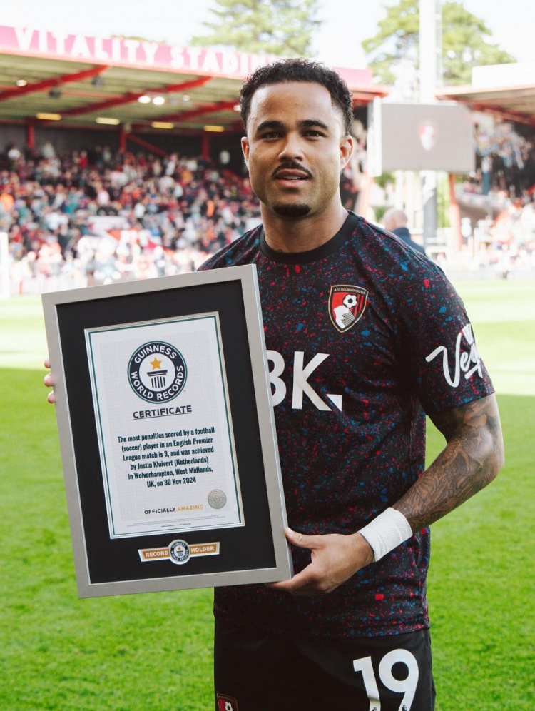 9月19日讯 伯恩茅斯俱乐部官方消息,球队翼锋贾斯汀-克鲁伊维特获得吉尼斯世界记录 认证,成为英超单场主罚十二码球最多的球员。