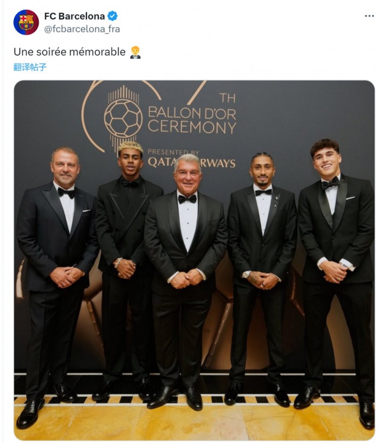 拉波尔塔、弗里克、亚马尔、拉菲尼亚、库巴西出席金球奖颁奖典礼,英超 视频直播巴萨官方社媒晒出他们的合照,配文:“一个难忘的夜晚。”