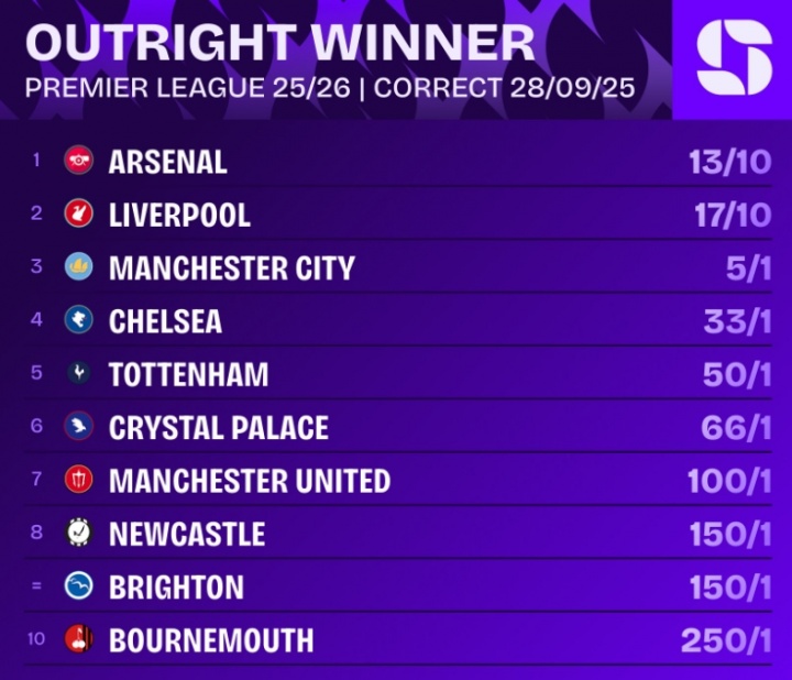 09月29日讯 本轮英超,阿森纳2-1反转 致胜球 纽卡斯尔联,看英超直播赛后有关机构更新了英超第一名 的赔率。