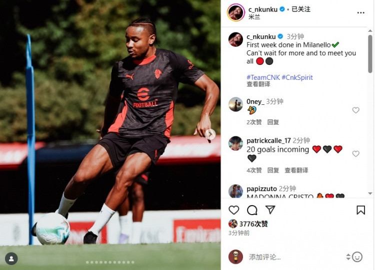 恩昆库在Instagram发文,谈到在AC米兰第一个星期的感受,很想在圣西罗证实自己的实力。