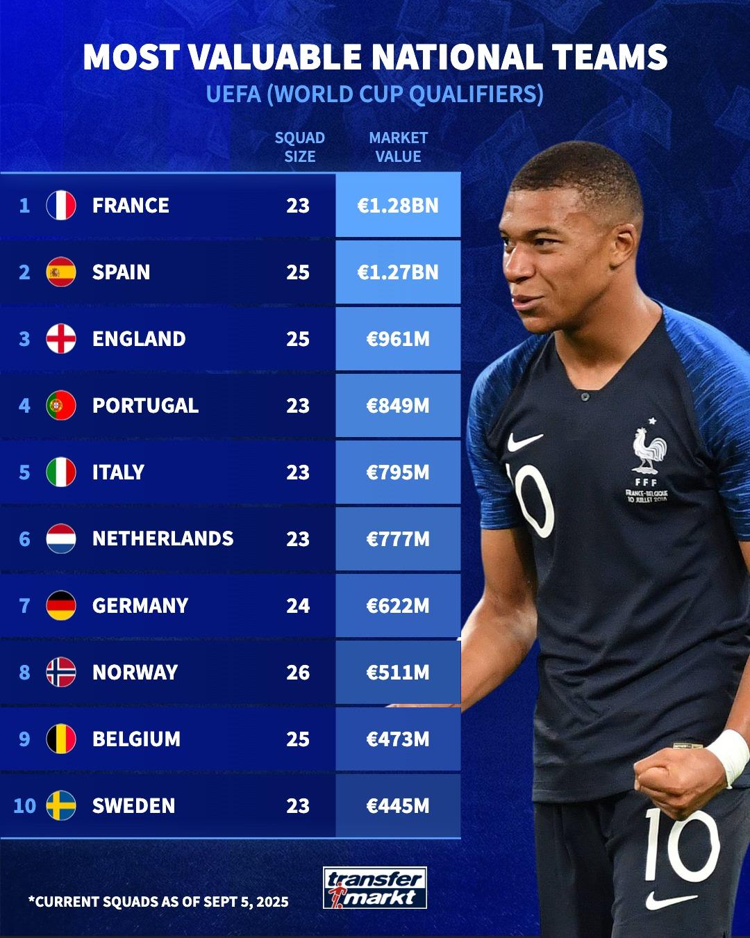欧洲国家队身价排行: 法国12.8亿欧居首, 西班牙、英格兰前3