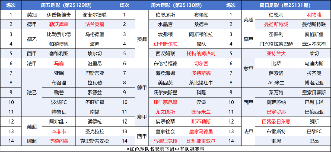 此外,本期国家队赛事 后国脚众多的豪门球队负伤 病影响较大,而包括曼城、切尔西、马竞、热刺即将面临艰难的魔鬼赛程,下周中即将欧冠职业联赛 阶段首轮比拼,上述4队皆入选了周末和下周足彩,其中皇家社会vs皇马(周六)、曼城主战曼联(周日),这两场赛事 需要特别留意具体球队重要球员的受伤 状况。