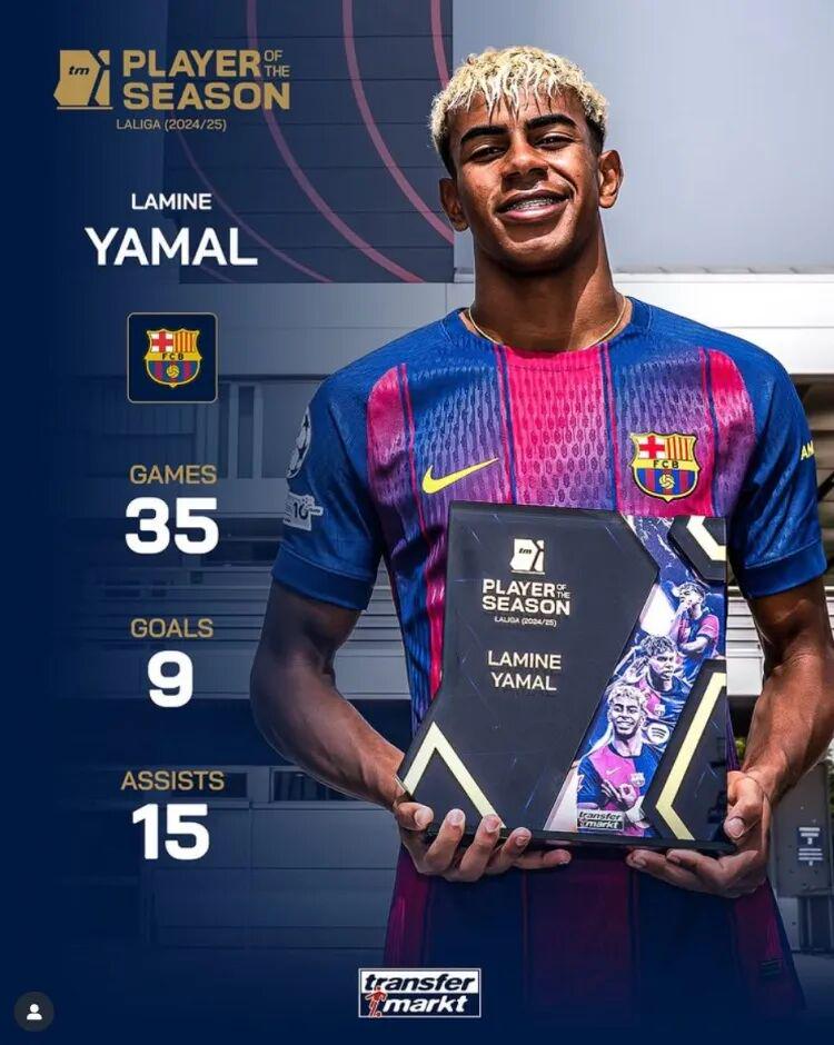 35场9球15助功 !德转官方:18岁巴萨翼锋亚马尔获评上赛季西甲最有价值球员