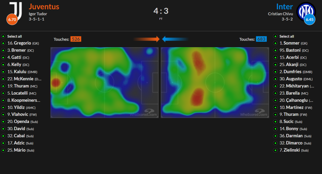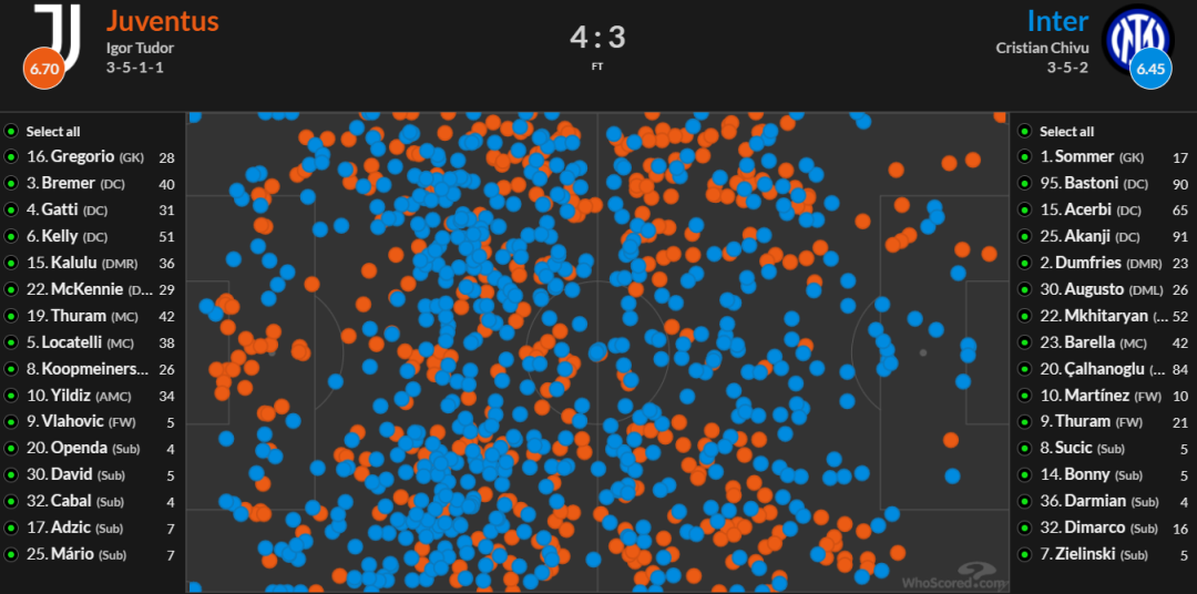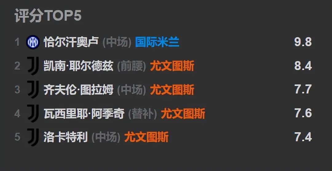 下半场,恰尔汉奥卢凌空斩完成双响,图拉姆兄弟同场得分 ,也是赛事 有趣部分。可是,国米球迷却没兴趣欣赏这些了,阿季奇神仙球致胜球 ,导致齐沃吃下了失败果实。最终尤文主场作战 4-3战胜国米,尤文开局三连胜,国米遭遇两连败。
