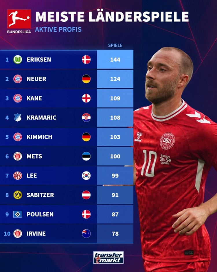 德甲现役球员国家队出场: 埃里克森144场最多, 诺伊尔、凯恩前三