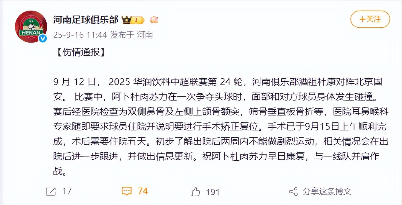 9月16日上午11点44分,中超又迎来一条最新消息,河南古代足球 俱乐部正式官宣一条坏消息,在河南队与北京国安队的赛事 中,泰山队租借球员阿卜杜肉苏力在一次争夺顶球时,面部和对方球员身体发生追尾。赛后经医院检查为双侧鼻骨及左侧上颌骨额突,筛骨垂直拍骨裂 等,医院耳鼻喉科专家随即要求球员住院并说明要进行手术矫正复位。手术已于9月15日上午顺利完成,术后需要住院五天。初步了解出院后两周内不能做剧烈运动活动 ,相关情况会在出院后进一步跟进,并做出信息更新。祝阿卜杜肉苏力早日复健 ,与一线队并肩作。