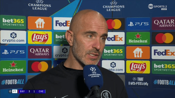 虎扑09月18日讯切尔西主指导教练员马雷斯卡在1-3输给拜仁慕尼黑的欧冠赛后,接受TNTSport采访。