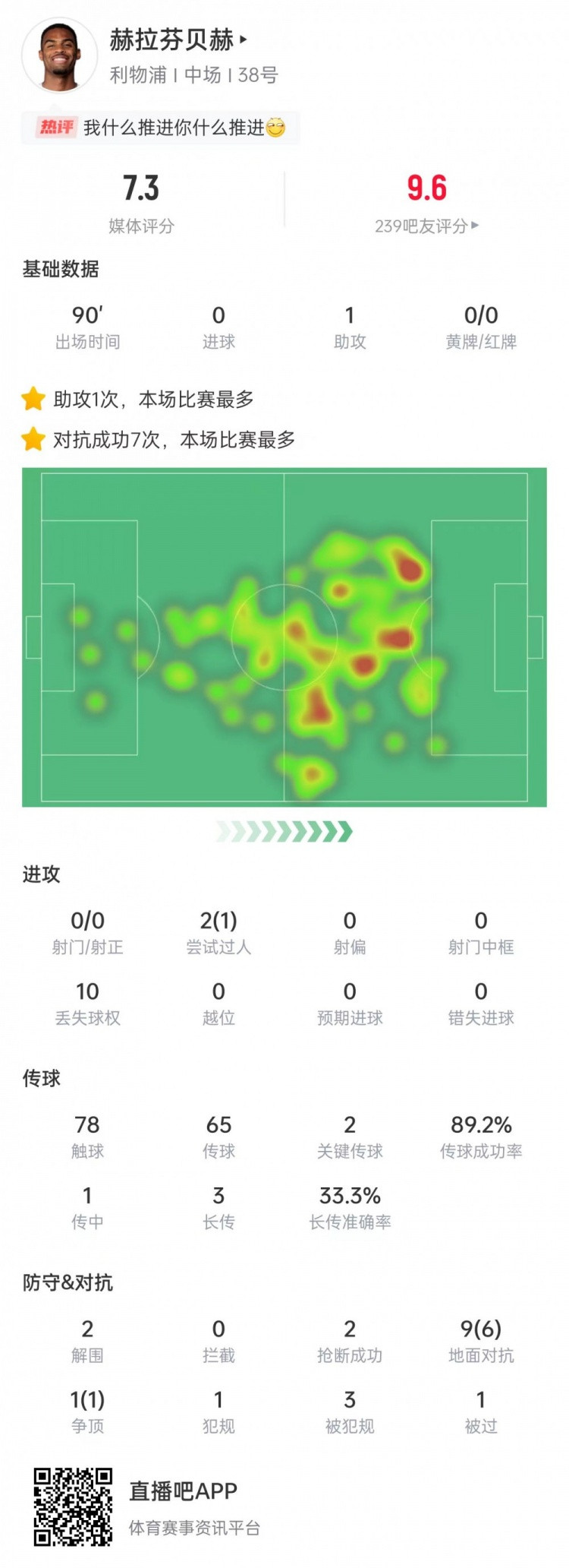 送出助功 +7次对峙 成功! 赫拉芬贝赫当选本场利物浦队内最佳球员