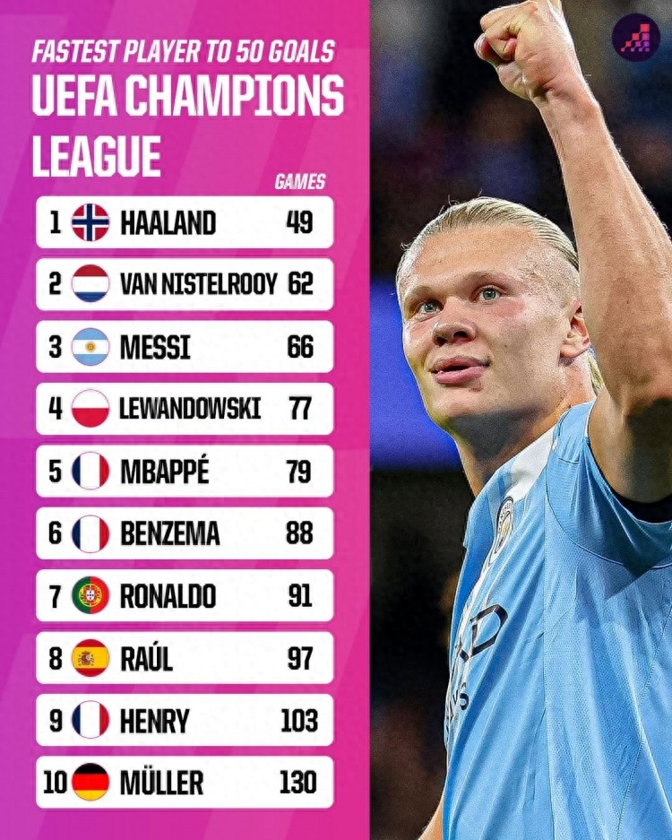 欧冠50球最快达成: 哈兰德49场居首, 梅西66场第3, C罗91场第7