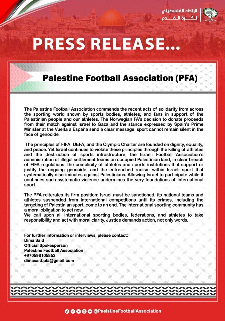 巴勒斯坦足协重申坚定立场:必须对以色列实施制裁,中止 其国家队及运动活动 员参加国际赛事资格,直至其针对巴勒斯坦体育界的暴行在内的所有罪行终结。国际体育界有道义有责任立即采取行动。