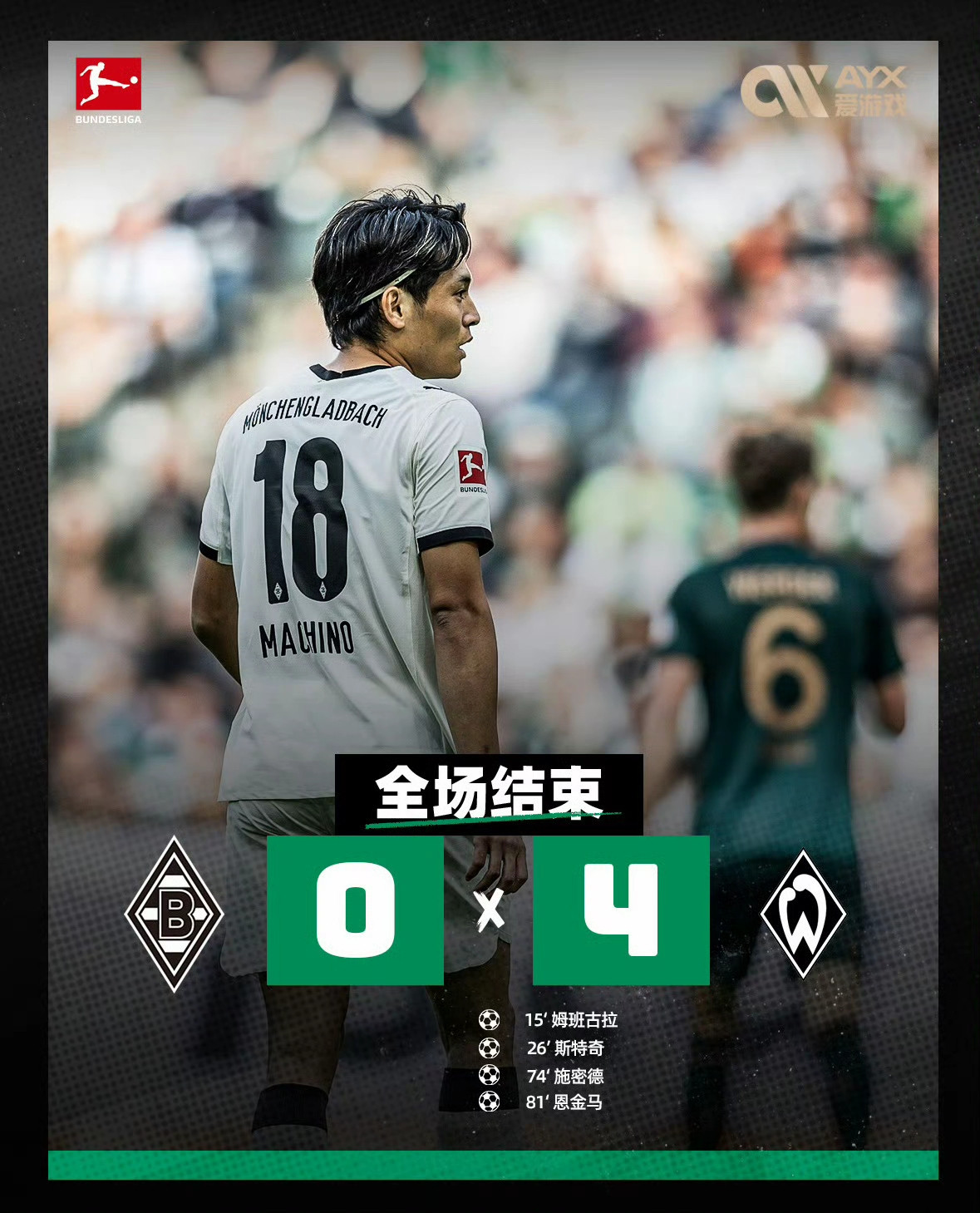 姆班古拉传射立功,恩金马后备 扩大比分,不莱梅客场应战 狂飙4球横扫门兴!