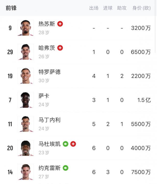 萨卡刚复出枪手锋线再伤一人,棍哥休2月+哈弗茨热苏斯还没好