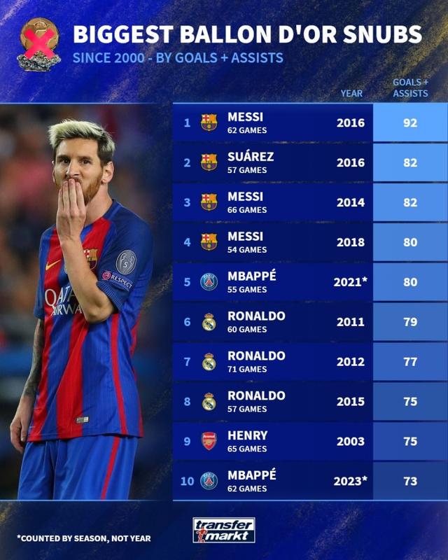 无缘金球年份最高得分 +助功 数据榜:前4梅西占3席 C罗3度上榜