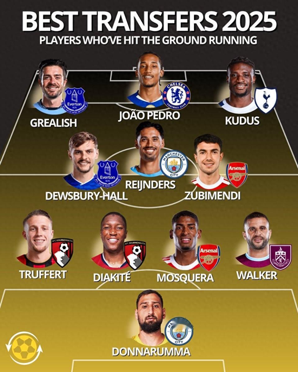 英超2025-26赛季已经进行了5轮赛事 ,英国媒体Football Hub评选出了英超2025年夏窗最佳转会11人阵(433),其中曼城、阿森纳、伯恩茅斯、埃弗顿均有2人在列,而领头羊、今夏花钱最多的利物浦没有球员入选。